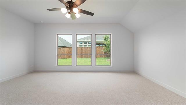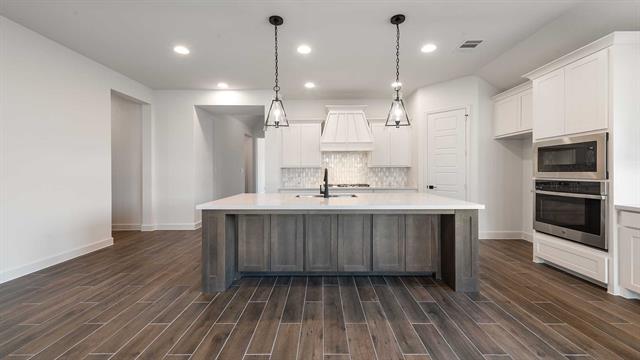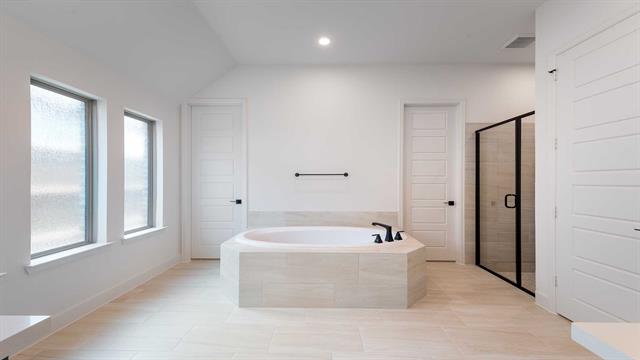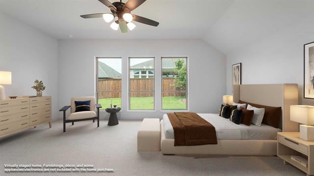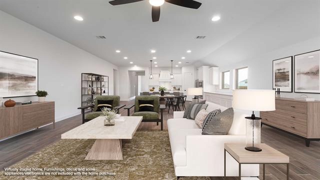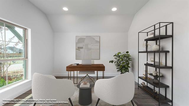 READY FOR MOVE-IN! Home office with French doors set at entry with 12-foot ceiling. Extended entry leads to open kitchen, dining area and family room. Kitchen features corner walk-in pantry, generous counter space, 5-burner gas cooktop and island with built-in seating space. Dining area flows into family room with a wood mantel fireplace and wall of windows. Primary suite includes double-door entry to primary bath with dual vanities, garden tub, separate glass-enclosed shower and two large walk-in closets. A guest suite with private bath adds to this spacious one-story home. Covered backyard patio. Mud room off two-car garage.