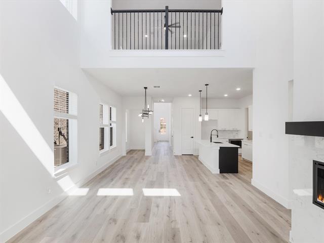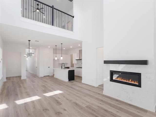 Ready Now! Feel like a Royal in our Alexander floor plan. Step into the epitome of modern living with this brand-new Monarch Home, where architectural sophistication blends seamlessly with everyday comfort. This 4-bedroom, 3.5-bath masterpiece includes a spacious game room and a functional pocket office, offering versatility for both entertainment and work-from-home lifestyles. Designed for discerning tastes, the home boasts premium finishes throughout. The Chef-Inspired Kitchen is outfitted with a JennAir appliance package, including double ovens and a 5-burner gas cooktop, making it a culinary dream. Enjoy the elegant touch of quartz countertops, a pot filler, Blanco Silgranit sink, and soft-close cabinetry with upgraded hardware. A decorative backsplash adds a sleek, modern flair. Gather around the crystal-accented gas fireplace under the ambient glow of luxury Kichler lighting. The Karastan Cultivated wood flooring in common areas downstairs as well primary bedroom, combined with 8-foot doors and 12x24 sleek tile accents, creates a clean and contemporary vibe. The Resort-Worthy Primary Suite has a luxurious primary bath featuring floating cabinets, a large frameless glass shower, decorative tiles, framed mirrors, and quartz countertops with undermount sinks. Enjoy effortless indoor-outdoor flow with a large covered patio—perfect for entertaining, relaxing evenings, or weekend barbecues, rain or shine. Enjoy gridless modern windows that provide unobstructed views and flood the home with natural light. The community is in fabulous location near an abundance of shopping, dining, entertainment, just minutes from PGA. Located within the highly acclaimed Frisco Independent School District, this home ensures top-tier education in a thriving community. Every detail in this Monarch Home reflects a commitment to excellence and precision craftsmanship, promising a lifestyle of comfort, elegance, and modern flair.