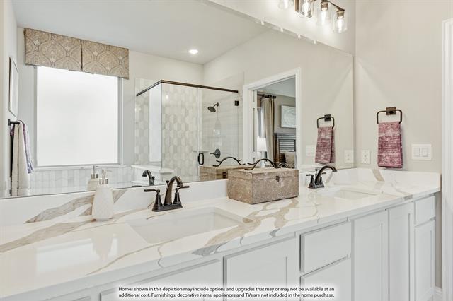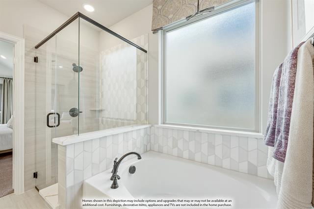 NEW! NEVER LIVED IN! Ready to Move In December 2025! Set on a deep interior lot in Union Park, the Rose II by Bloomfield Homes offers 5 bedrooms, 4 full baths, and thoughtful design across two levels. Upgraded Casa Blanca brick paired with Austin White stone, buff mortar, cedar garage doors, and a welcoming covered front porch framed by an 8' glass-paneled front door provide striking curb appeal. Open the door to engineered wood floors that extend through the main living areas, blending with a modern curved staircase and soaring stacked stone fireplace. The Deluxe Kitchen combines Level 4 White Ice granite countertops with double-eased edges, a vent hood over the cooktop, undercabinet lighting, pendant lights at the island, and Charleston Pure White cabinetry with a trash pull. A walk-in pantry complements the generous storage. The adjoining Family Room centers on a floor-to-ceiling fireplace with a stained box mantel, while the modern stair railing continues above at the game room half-wall overlook. The downstairs layout includes a private Study behind glass French doors, a secondary bedroom with a full walk-in shower in its bath, a large laundry room with a mud bench, and the spacious Primary Suite with a deck-mounted tub, a fully tiled shower with a seat, a dual sink vanity, and a large walk-in closet. 2 bedrooms upstairs are connected by a Jack-and-Jill bath, while the 5th bedroom has a full bath just outside. Upgraded tile is found in all baths and the laundry room, while carpet softens secondary bedrooms. Outdoor living is extended with a covered back patio equipped with a gas drop for grilling. Additional upgrades include a tankless water heater, whole-home surge protector, upgraded garage door with opener, full gutters, and flood lighting. Community amenities at Union Park include parks, trails, and recreational spaces, all within reach of this stylish new home! Call or visit Bloomfield at Union Park to learn more.
